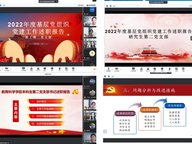 苏书记指出,2023年,党支部在压紧压实党建工作主体责任方面要狠下功夫,围绕“强化支部工程建设、严格党内组织生活”主题,开展“点、线、面”党建系列工程建设。“点”是以党建与业务融合为支点,开展符合专业特点的课程思政、读书分享会,建立学习型党支部;“线”是以党员的教育管理为主线,严肃党内政治生活,建立党员教育管理监督档案,包括学习卡、汇报制度、支部工作日历等,在发挥党员先锋模范作用方面下功夫;“面”是抓支部党建品牌建设,每个支部都要创建自己的支部建设品牌,突出专业特色,把支部建设抓实落地,以高质量党建发展推动一流团队建设,以实际行动践行党的二十大精神。