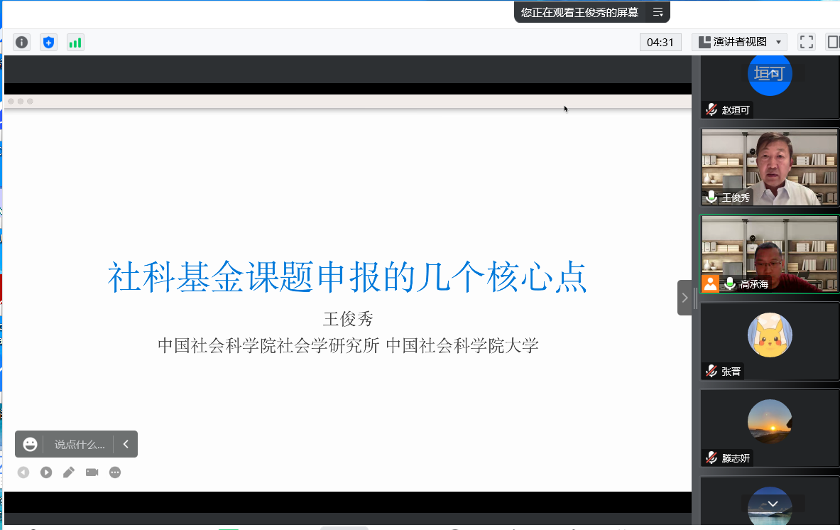 王俊秀教授结合自己多年申报国家级课题的经验,主要从选题的问题意识、文献综述、学术研究积累、合适的研究策略与方法、研究框架、整体完善等几方面介绍了社科基金课题申报需要注意的几个核心问题。最后还指出了若干社会热点问题,引导老师们从中选题,并分享了如何在社会政策下做学术研究。高承海根据自己近几年的课题申报经历也给线上教师分享了一些有益经验,他尤其强调选题及其表述的重要性,指出国家级课题选题一定要有国家站位,选题还应兼顾自己前期研究基础。