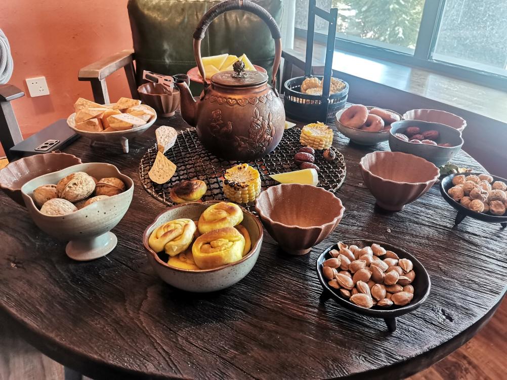 缕缕茶香沁心脾,云卷云舒入梦来。茶艺师为我们展示了泡茶的全过程,老师们聚精会神的观察着、学习着。而亲自参与泡茶,煮茶的老师,亲身体验了中国茶文化的博大精深以及所带来轻松惬意的感觉。在这个过程中,老师们慢慢卸下疲倦,围坐于温暖的炭炉旁谈天说地,谈笑风生,茶水在壶内沸腾,烤制的土豆、玉米、花生逐渐散发香气。室内温度慢慢升高,情感也在悄然升温……