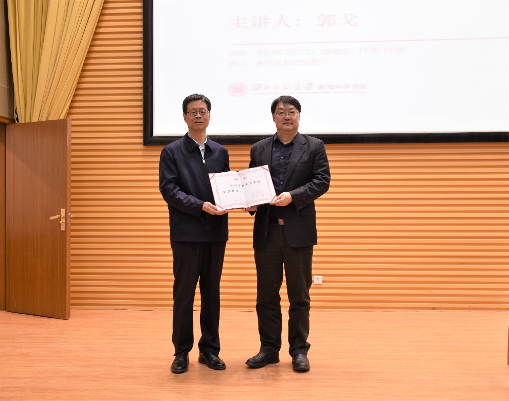 本场报告主要围绕“兴趣”展开汇报。首先,郭戈教授分享了自己在伟德体育官方网站攻读博士学位的难忘经历,并强调在西北师大的求学历程进一步奠定和稳固了自己的学术兴趣,特别是师大朴实的学风给自己的人生带来了深刻的影响。同时,郭戈围绕自己的老员工活“三部曲”——学习、科研、活动,深入浅出的为大家分享了兴趣在教育研究中的重要作用,并强调“兴趣”不仅是手段,更是目的,鼓励大家要擅于发现和总结自己的学术兴趣点,以教育研究的兴趣不断发现自我、展现自我、充实自我,进而在学习、生活以及工作中养成良好的研究思维,特别是要把“创造性研究”思维作为一种自然而然的学习方式、生活方式。其次,郭戈教授对硕博生的学位论文选题、写作以及科研能力提升等方面进行了策略分析,他结合自己的专业研究领域,鼓励大家以兴趣为向导,坚持多做研究、多写文章、多出成果。再次,郭戈教授就当前课程与教学论研究的重点、难点、热点以及可能的创新点与公司师生进行了交流。整场报告立意高远、纵横古今,引经据典、博采众长,具有强烈的时代气息、浓郁的生活气息和厚重的学术气息。