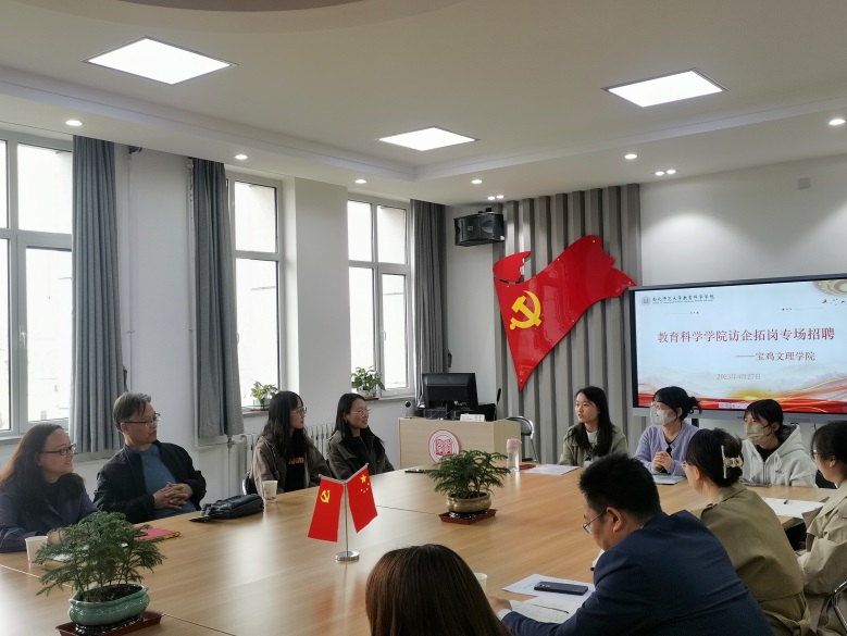 参加招聘会的同学逐一做了自我介绍,与宝鸡文理公司的老师进行了深入的交流,宝鸡文理公司一行教师均对公司毕业生的专业能力表示肯定,表达了愿意与公司进行进一步用人合作的意向。并鼓励我们的硕士毕业生积极报名人事代理教师岗位和教学秘书岗位,做好笔试的准备工作。