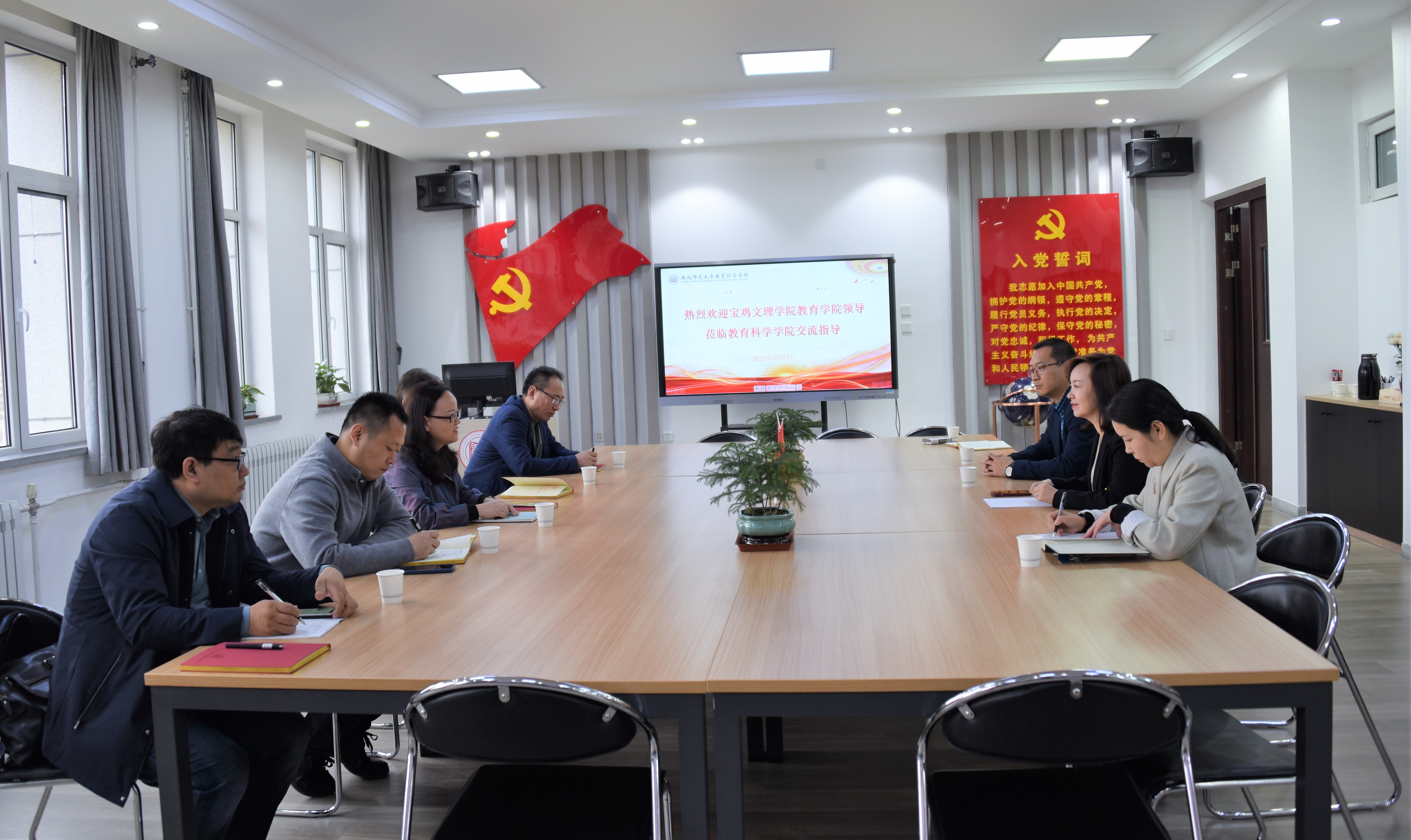 2023年4月27日上午,宝鸡文理公司教育公司经理马多秀教授及公司班子成员、教师代表一行五人来伟德国际victor1946考察交流,于知行校区弘文楼501室举行座谈交流会,公司党委书记苏丽蓉同志主持会议。