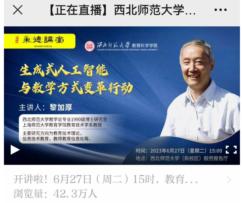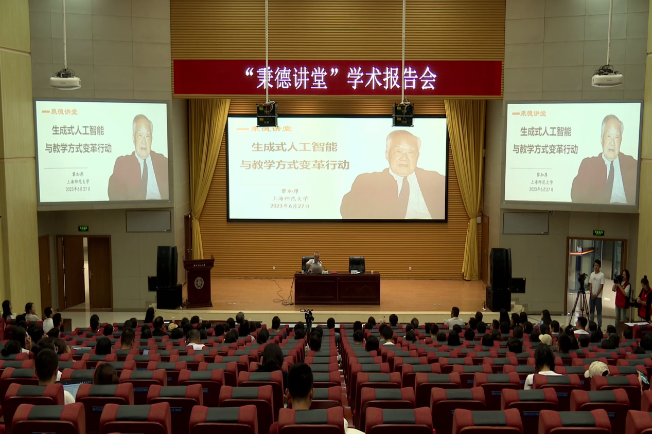 627日下午,伟德国际victor1946“秉德讲堂”第四讲在知行校区毅然报告厅举行,此次主讲人为公司杰出员工、教育部全国教师教育信息化专家委员会委员、教育部现代远程教育工程资源建设基础教育项目组专家、上海市教委双名工程基地主持人、上海市教育软件资源专家委员会专家、上海师范大学教育技术学系黎加厚教授,主讲内容为“生成式人工智能与教学方式变革行动”,讲座由伟德国际victor1946经理王兆璟教授主持,本场学术活动线下参与人数近300余人,线上参与人数最高达42万。