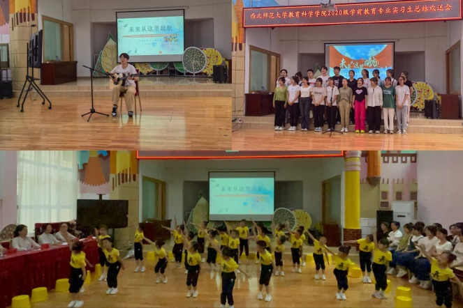 昆仑幼儿园大五班幼儿为实习生哥哥姐姐们表演了精彩的舞蹈《匆匆》,实习生唐琛表演吉他弹唱《我们俩》,全体实习生表演合唱《再见》,伴随着大屏幕滚动播放的实习精彩瞬间,能感受到实习员工三个多月以来的汗水、成长以及与幼儿园老师和孩子们建立的深厚感情。