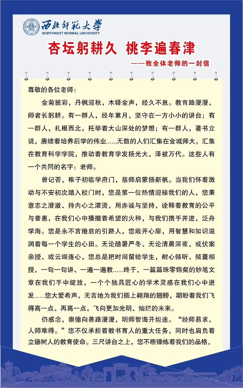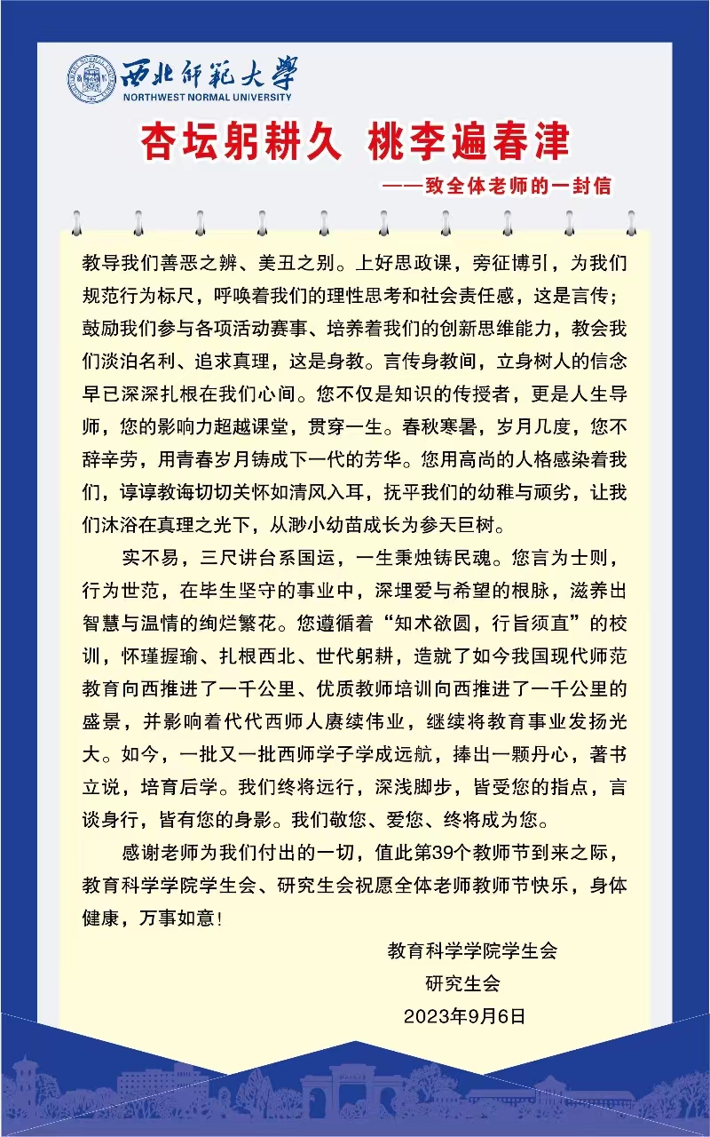 通过此次系列活动,培养同学们的感恩之心,让同学们以老师们为榜样,大力弘扬教育家精神,牢记为党育人、为国育才的初心使命,树立“躬耕教坛、强国有我”的志向和抱负,自信自强、踔厉奋发,为强国建设、民族复兴伟业作出新的更大贡献。