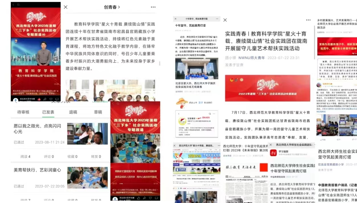 本年度各项暑期实践活动开展过程中,各实践团积极创新宣传形式,把稳宣传风向,以文稿、组图、日记、视频等形式持续加大宣传力度、扩大积极影响。实践期间获得中国教育报、中国青年网、中国老员工网、学习强国等多家媒体的报道,相关稿件刊登在未来导报、青年观潮、创青春、甘肃青年等刊物及公众号上,并受甘肃省电视台的采访,将实践成果在视听甘肃、甘肃省电视台都市频道上展播,形成新闻类成果43篇,感悟类成果119余篇,影像类成果5部。同时实践活动也获得当地政府的认可,形成了良好的社会评价和反响。