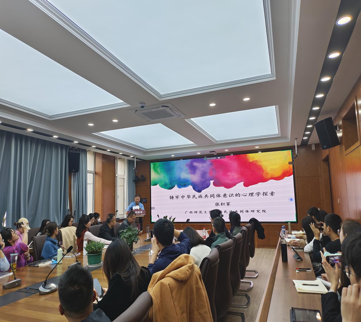张积家教授围绕“如何铸牢中华民族共同体意识”做了五方面内容的探讨。第一,讲述了中华民族共同体认同的心理层次与心理表征,并结合此探讨了中华民族共同体认同的形成路径。第二,用容器隐喻和差序格局两个概念论述了中华民族共同体认同的性质。第三,描述了民族意识与中华民族共同体意识之间的关系,其存在着双强、弱强、强弱、双弱的关系。第四,基于陈寅恪“化认说”论述了“化认”的内涵,即文化认同之“化”、民族认同之“认”,并指出蕴藏着民众对人文价值之期许和更深层次的民族精神之追求。第五,将顾颉刚的理论与费孝通的理论有机整合,并对中华民族多元一体格局的认识与反思,提出三点未来发展出路:必须充分看到中华民族内部各民族长期交往交流交融的历史和现实,坚持中华民族共同体的理念;更要强化中华民族共同体意识,适当弱化各民族的民族意识;要加强“三交”,加强各民族之间互嵌,提高民族团结意识。