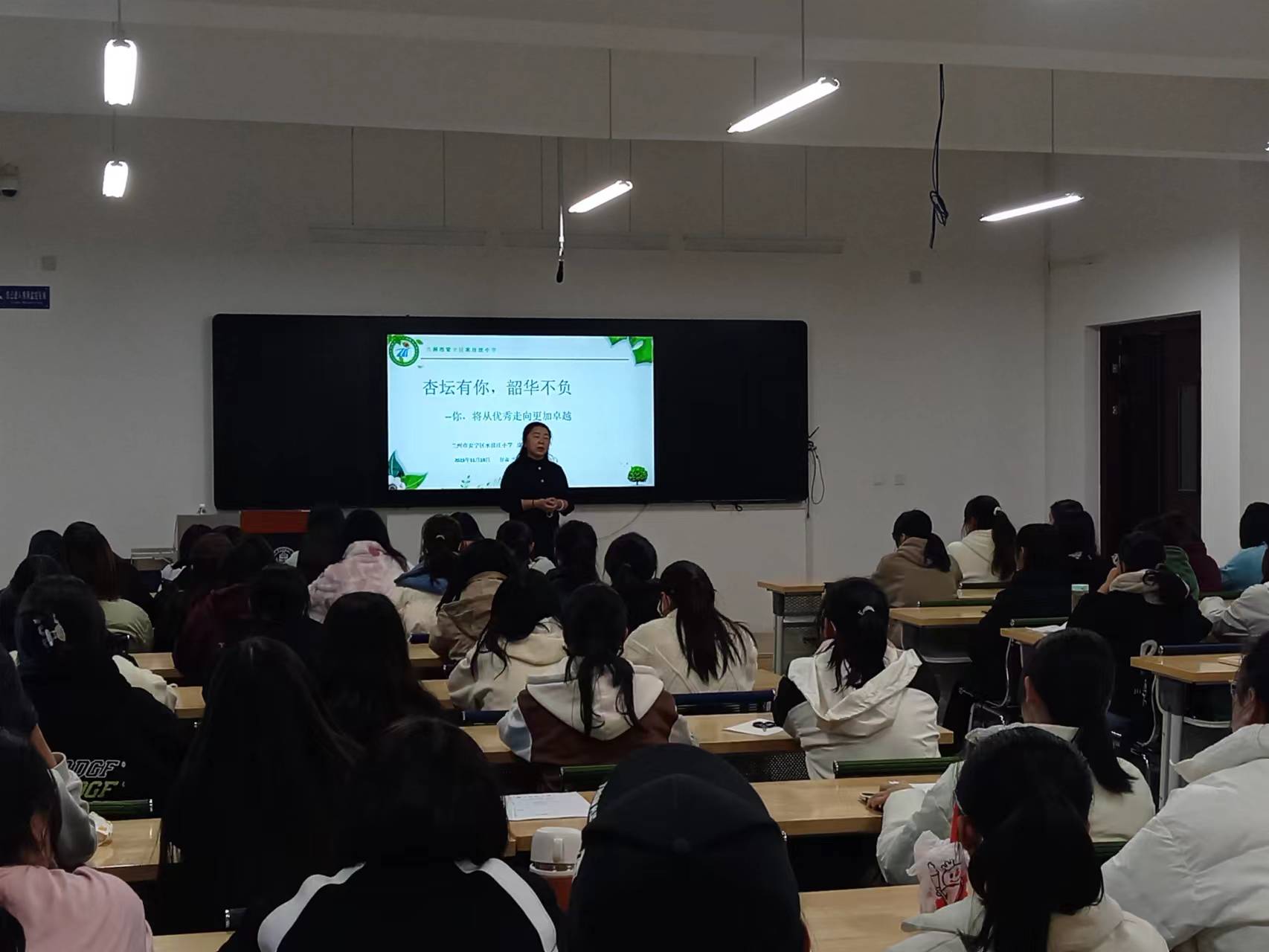11月23日下午,兰州市安宁区水挂庄小学董事长、高级教师康玉琴为2022级、2023级小学教育专业的同学做了“杏坛有你,韶华不负——你,将从优秀走向更加卓越”的讲座,小学教育系主任毛耀忠老师主持讲座。
