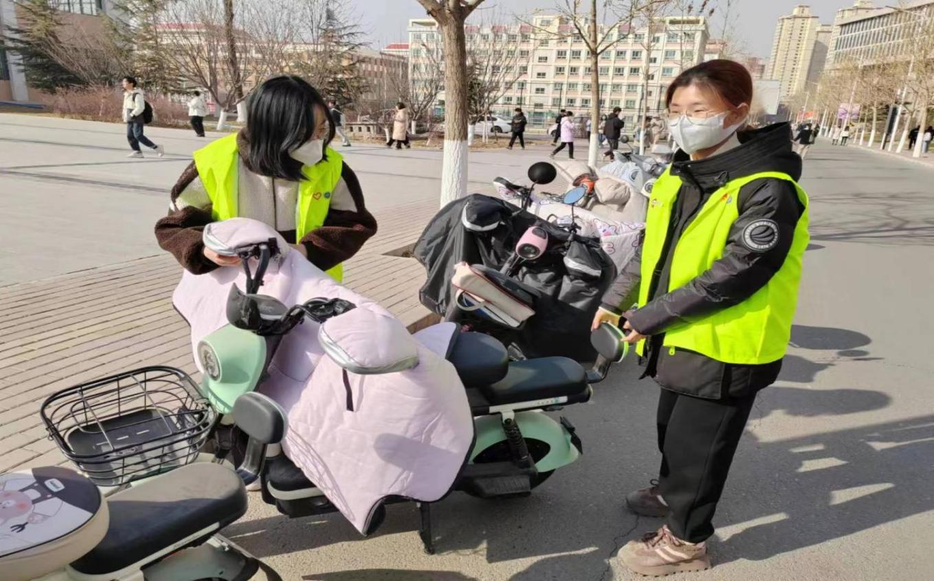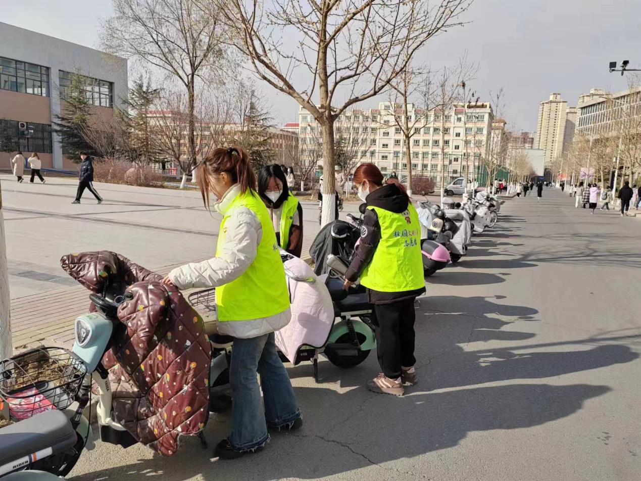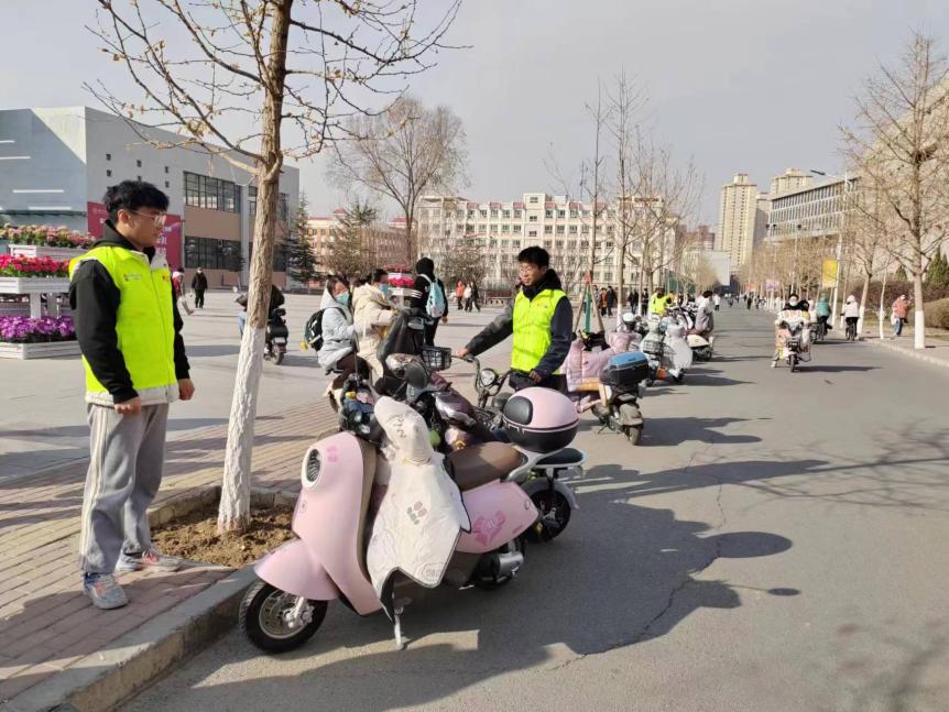 活动开始前,各班的志愿者同学们无惧凛冽的寒风,按时到岗,身穿醒目的“文明引导”绿色马甲,引导电动车有序行驶、停放,志愿者们热情洋溢,志愿活动热火朝天,为冬日的萧瑟增添了一抹温暖的风景。