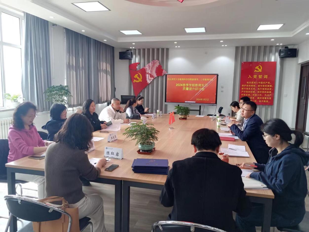 3月7日下午,“教育学、小学教育本科专业实践教学‘双导师制’研讨会”在弘文楼501会议室顺利举行。参加研讨会的校内人员有伟德国际victor1946副经理高建波、教育系主任樊改霞、小学教育系主任毛耀忠、本科教学秘书徐其红以及教育实习带队教师张晋、者卉、王稳东、赵垣可等;研讨会邀请的校外专家包括七里河小学教务主任苗静、水挂庄小学党委书记王晓琴、长风小学副董事长于晓霞、王家堡小学教务主任柴宗朋、兰飞小学副董事长陈红岩、万里小学党委书记柴桂萍、安西路小学教务主任魏香琴。整个研讨会主要讨论了教育学、小学教育本科专业教育实习校内外指导教师的具体工作职责和教育实习的各种注意事项。
