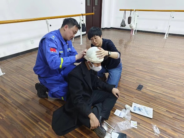 在创伤救护培训项目中,曹老师为每个同学们发放了应急救护包。同学们积极参加实操训练,认真学习了止血包扎、骨折固定等急救技能,并通过反复练习,逐渐掌握包扎要领。
