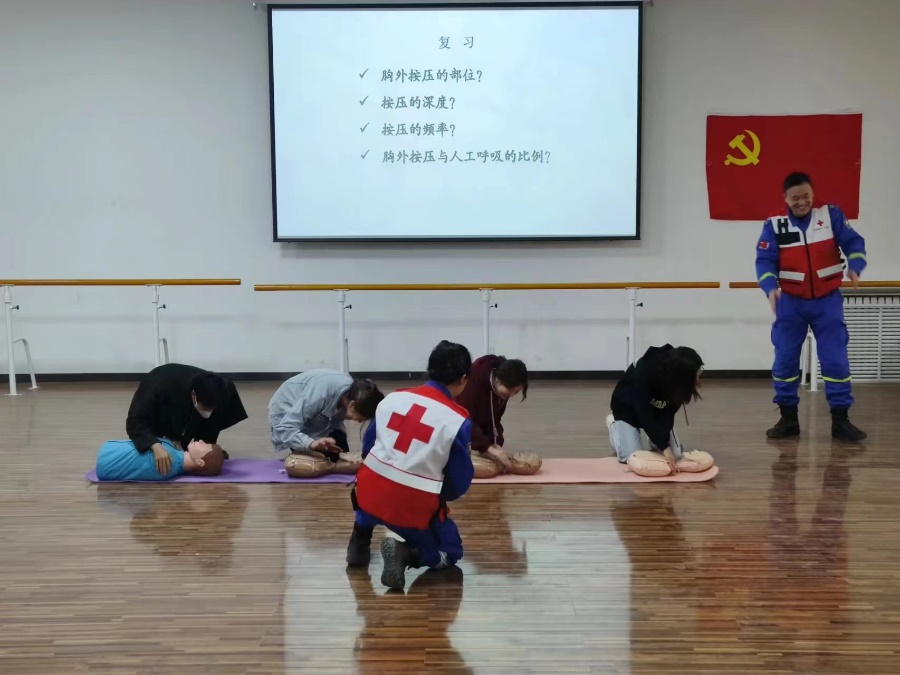 培训分为理论知识和实操技能两个环节,主要内容包括心脏复苏、气道异物梗阻处理、创伤救护等专题内容。在理论知识培训过程中,曹磊老师通过幽默生动的讲解和示范,由浅入深地向同学们传授了科学的应急救护知识和方法,并重点讲授了胸外心脏按压与人工呼吸的操作方法以及创伤救护,还针对气道异物梗阻现场教学海姆立克急救法。