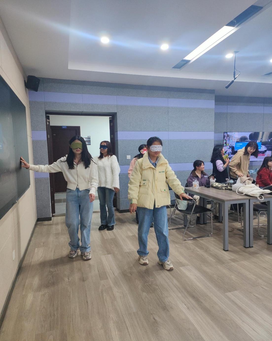 定向行走是视力残疾员工生存与发展不可缺少的技能之一,是盲人运用各种感官确定自己在一定环境中及其他物体之间的相互位置关系的过程,训练盲生能在各种环境中进行有目的地、安全、有效、独立自如的行动。因此在上课前,张老师先让员工们戴上眼罩初步体验盲人行走的诸多不易。