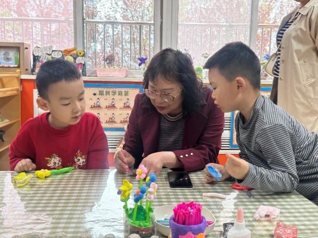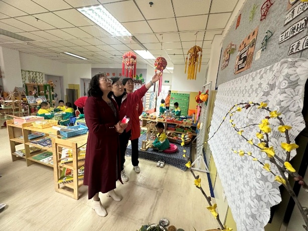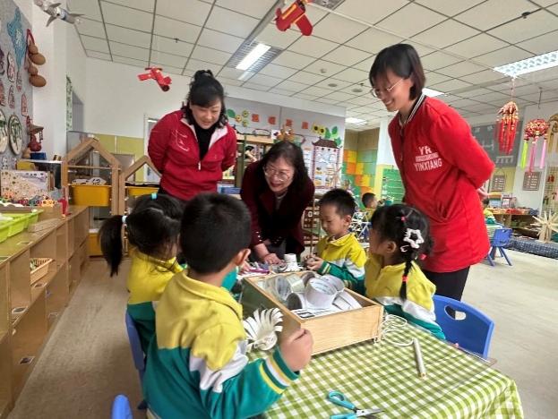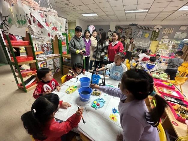 郑名教授带领大家先进入各班级,指导教研组成员观察班级幼儿游戏状态、区域材料投放、教师指导方式,与班级幼儿进行对话了解游戏开展,与班级老师深入交流各班幼儿整体的发展水平和游戏情况。