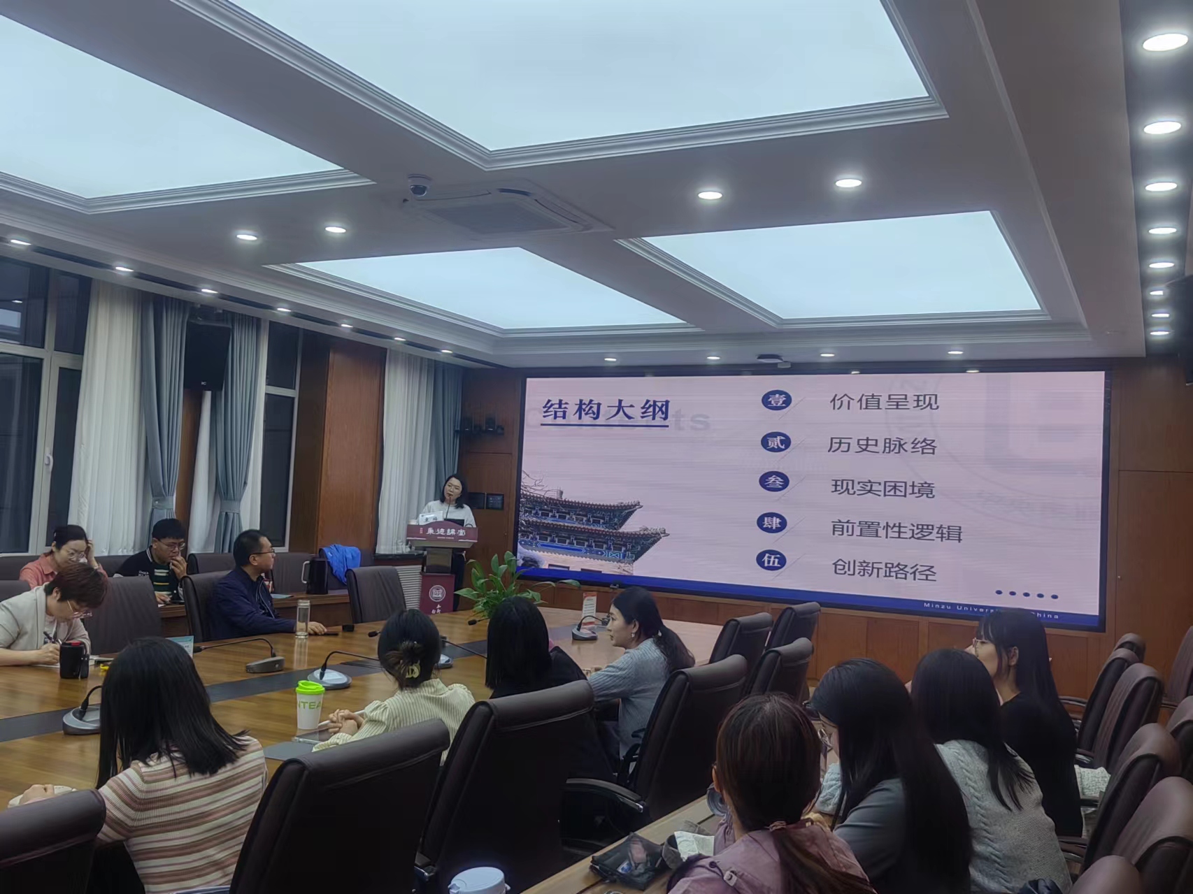 袁梅教授主要从“价值呈现”、“历史脉络”、“现实困境”、“前置性逻辑”、“创新路径”等五个方面对高等教育推动国际传播做了报告。袁教授结合中央民族大学教育公司的团队实践,提出了“发挥知识原创力与供给力,提供智识支持性服务”、“竭力培养国际传播人才,提供人才供给性服务、积极延展传播空间,提供技术保障性服务”等创新路径。报告结束后与现场师生进行了热烈互动。最后,高承海教授对袁梅教授的精彩报告表示衷心的感谢。