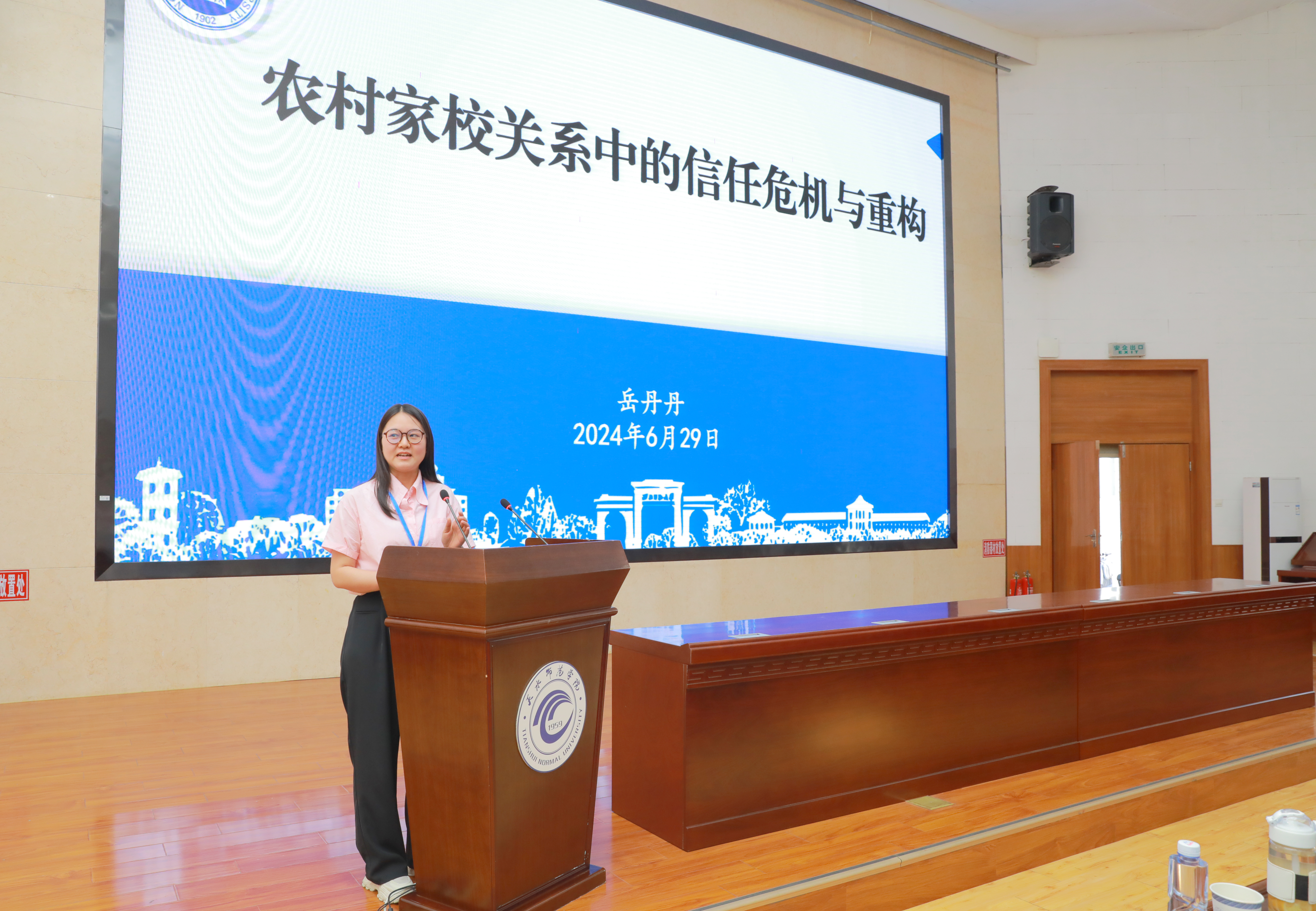 赵垣可、夏丽蓉、岳丹丹分别做了题为《新世纪以来我国农村教师补充方式的审思与改革趋向》《数字化赋能乡村学前教育在地化发展的价值意蕴与实践路径》《农村家校关系中的信任危机与重构》的报告。博士生魏婧做了题为《乡村定向师范生缘何“流”与“留”?—基于文化再生产理论视角》的报告,硕士生郑丹妮做了题为《教育数字化转型下乡村小学教师数字素养的现状与提升》的报告。