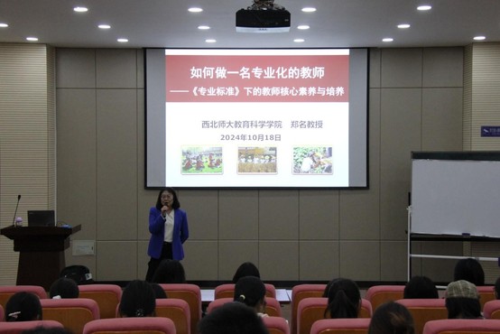 10月18日,郑名教授为2024级全体本科生讲了题为“如何做一名专业化的教师——《专业标准》下的教师核心素养与培养”的专业导训课。