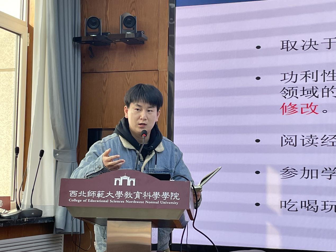 来自高等教育学专业的学术型硕士杨一鸣从学什么、怎么学、怎么写三方面分享了他的学习经验,他指出学什么取决于个人的目标,在确定目标后就要开始寻找自己的研究方向。接着,他分享了两种学习的方法:文献阅读以及交流讨论。最后,杨一鸣同学还给在场同学分享了一些学习生活的建议。