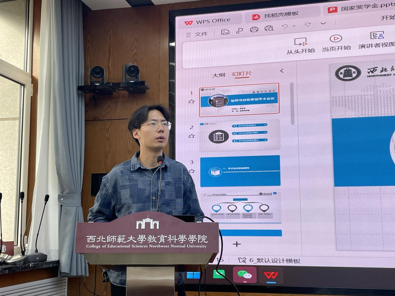 来自高等教育学专业的学术型博士曹志勇以如何寻找和参加学术会议为题,从学术会议的重要性、学术会议的搜寻途径以及学术会议的参加要点三方面展开分享,给大家带来了一场实用性非常强的分享。他在分享中说道:“参加学术会议不仅能够信息交流,进行知识更新,建立学术人际网络,更重要的是能够展示研究成果,激发创新思维,积累学术资源。”
