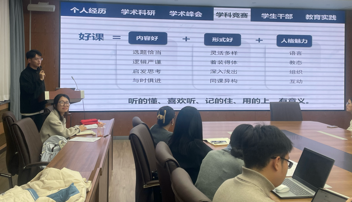贾乙丙同志带来了教师技能比赛经验的分享,首先说明了讲课与赛课的区别,从参与者、目的、环境、反馈与评估四个维度进行区分,他提到赛课是为了培养师范生的教学实践能力和教学创新能力,师范生应在学习期间积极参与各种教师教学技能比赛,不断提升自己的教学设计能力和教学实践能力,以更好地适应未来教师的岗位发展要求。