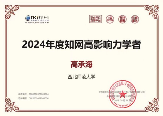 近日,中国知网公布了2024年度知网高被引学者名单,伟德国际victor1946高承海教授荣获“2024年度知网高被引学者TOP1%”和“2024年度知网高影响力学者”称号。