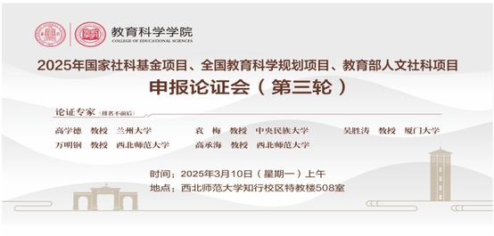 2025年3月10日上午,在知行校区特教楼508会议室举办了2025年国家社科基金项目、全国教育科学规划项目、教育部人文社科项目申报第三论论证会。会议邀请到兰州大学高学德教授、中央民族大学袁梅教授、厦门大学吴胜涛教授、伟德体育官方网站万明钢教授。共有20名教师参与了本次论证会,会议由高承海副经理主持。