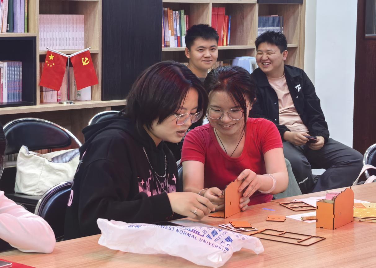 支部书记杨雅也为毕业生党员同志送上了一份特别的毕业礼物,这份礼物不仅蕴含着对毕业生党员的祝福,更寄托着对他们未来学业和事业的美好期许。支部书记杨雅对毕业生党员深切寄语:“笔筒方正,愿你们在未来的人生道路上,如它一般,坚守原则,行得端、坐得正,初心向党,前程似锦。”收到礼物后,大家在活动现场开始进行笔筒拼接,现场气氛温馨融洽。