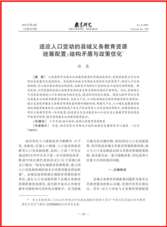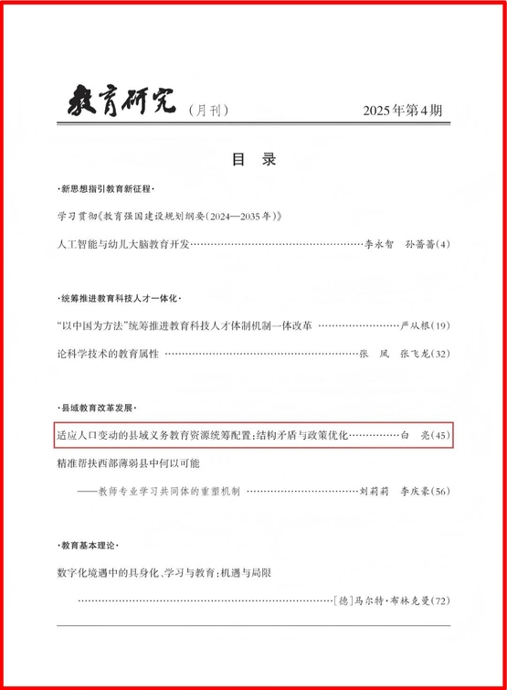 近日,公司白亮教授在《教育研究》2025年第 4期发表题为《适应人口变 动的县域义务教育资源统筹配置:结构矛盾与政策优化》的学术论文。《教育研 究》作为教育部主管、中国教育科学研究院主办的全国性教育理论权威期刊,创 刊于改革开放初期,是我国教育理论研究领域历史最悠久、影响力最大的综合性 学术刊物,被学界公认为教育理论研究成果发表的最高平台之一。